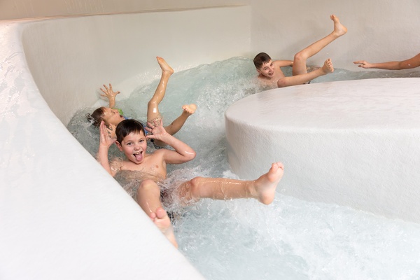 Dévalez les toboggans, plongez dans les tourbillons de la rivière rapide, barbotez dans la pataugeoire avec les tout-petits, nagez dans la piscine extérieure ou détendez-vous à la lagune d’eau chaude !